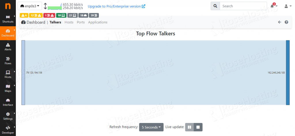 Ntopng is a web-based application for tracking the network traffic on your server. It is free and open-source and supports different operating systems like Linux, Windows MacOS and etc. Ntopng is a very useful monitoring tool that shows, multiple graphs in the GUI such as network usage, analytical data, bandwidth utilization, apps and etc. Also, Ntopng analyzes the traffic and sorts it by source/destination.